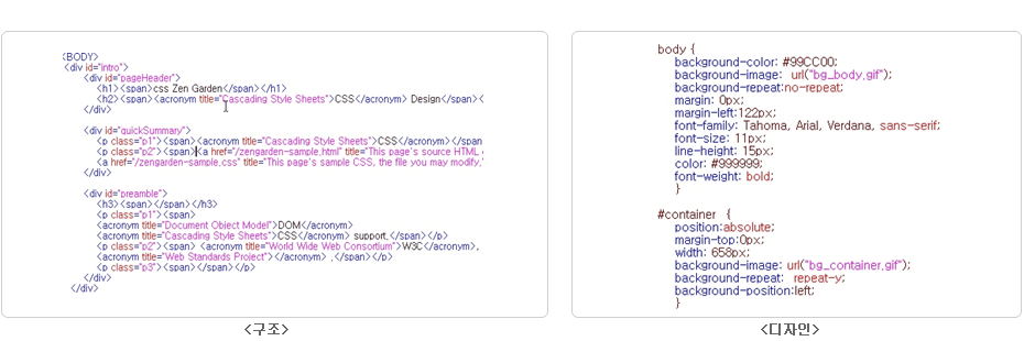 웹표준 코딩은 유지보수가 매우 간편하며 구조(HTML)와 디자인(CSS)의 분리로 일관성 있는 웹페이지를 유지할 수 있습니다. |